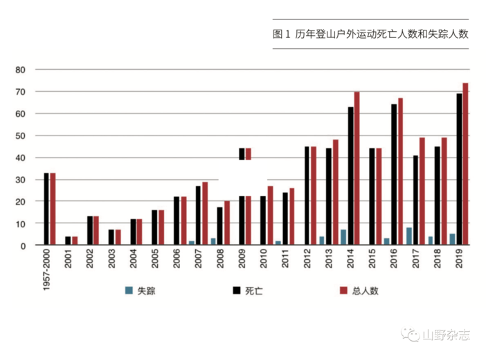 根据中国登山协会登山户外运动事故研讨小组的不完全统计,2019年中国大陆全年事故发生的活动中参与总人数2055人,事故总人数942人;受伤事故82起(其中两起受伤事故与死亡事故是同案例),受伤人数105人;死亡事故49起,死亡人数69人;失踪事故5起(其中两起失踪事故与死亡事故是同案例),失踪人数5人(如图1);无人员伤亡事故140起。