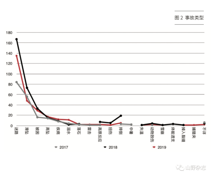 近两年,事故数量的增多导致事故类型也越来越多,从迷路、滑坠、被困、高坠、疾病等上升到十几种(见图2)。2019年与2018年相比,事故类型基本相同,迷路事故数量仍高居榜首,同时也出现了多年未曾出现的捕猎夹致伤的事故。