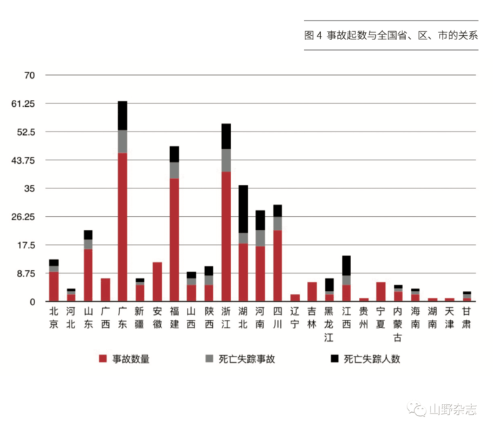 与2018年相比,2019年广东、浙江、福建的事故起数仍较多,山东、陕西事故有所下降,湖北因为一起较大的群体性事故,死亡人数达历年之最,西藏、青海、云南未收到相关事故报告案例。