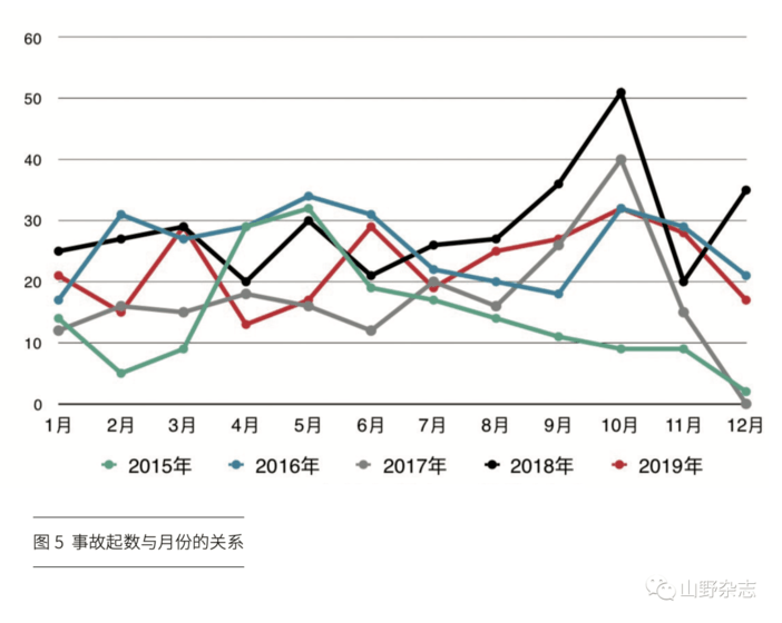 从图5来看,根据5年来每月事故数据的对比,2019年全年事故起伏变化较小,与往年相比,整体数量基本呈现稳中有降。