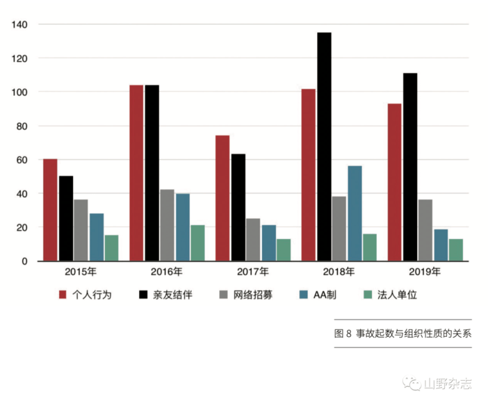 由图8可以看出,2019年,个人行为、亲友结伴的事故仍是年度事故多发的主要组织形式,在全部事故中占比75%,已连续三年有小幅增加,网络招募、AA制、法人单位组织的事故数量基本保持稳定状态。由此可见,事故数量与组织形式密不可分。