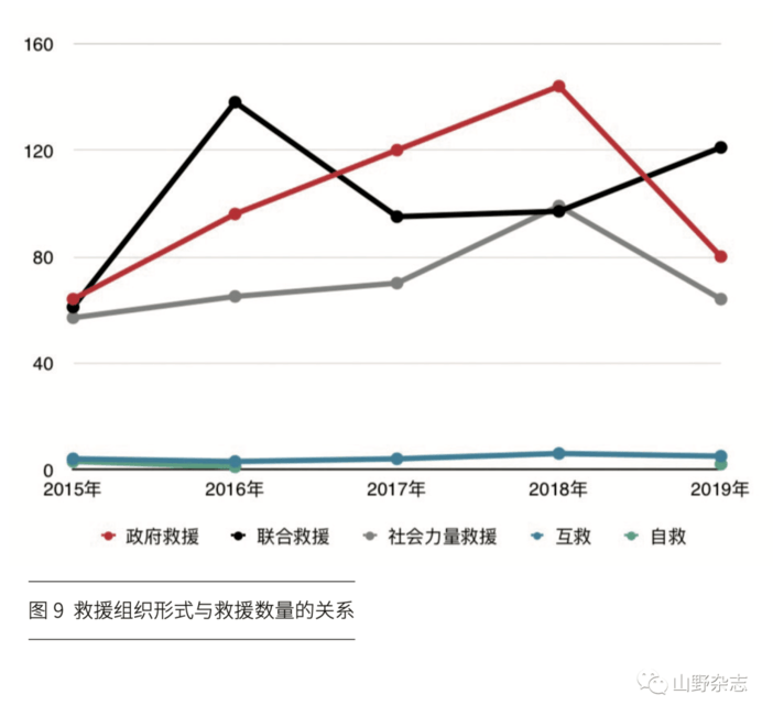 从图9来看,继2016年后,2019年联合救援再次成为主要的救援组织形式,政府救援数量略高于社会力量救援数量。根据救援反馈情况来看,部分地方110接警后,根据事故发生的山区环境,联合当地山地救援队伍共同实施救援。