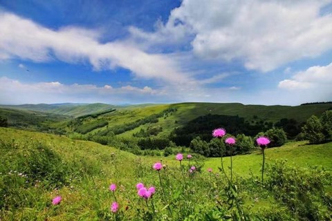 饮马池位于岚县北部岢岚县交界处,海拔2222米,每年七八月这里是野花绽放的世界,各种野花把草地编织成绚丽的花毯。牛羊、风车、草甸,绿茵如毯,山花烂漫,牛羊悠闲的低头吃草,沿途都是高大的松林,走在林中小道中,太适合拍森系照片了。风车缓慢转动,一切都是岁月静好的模样。
