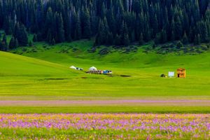 每年5月中到6月底,是喀拉峻草原夏季摄影黄金季节。一片片野花在喀拉峻草原上怒放,将草原铺上了一层五色的花毯。远处的天山被阳光映照得熠熠生辉,绿草、鲜花、河溪、森林、雪峰、峡谷……为我们定义了一种全新的立体景观。
