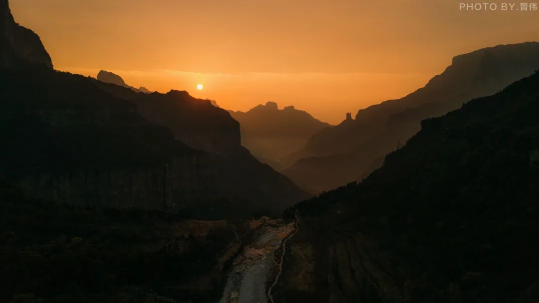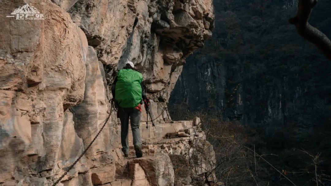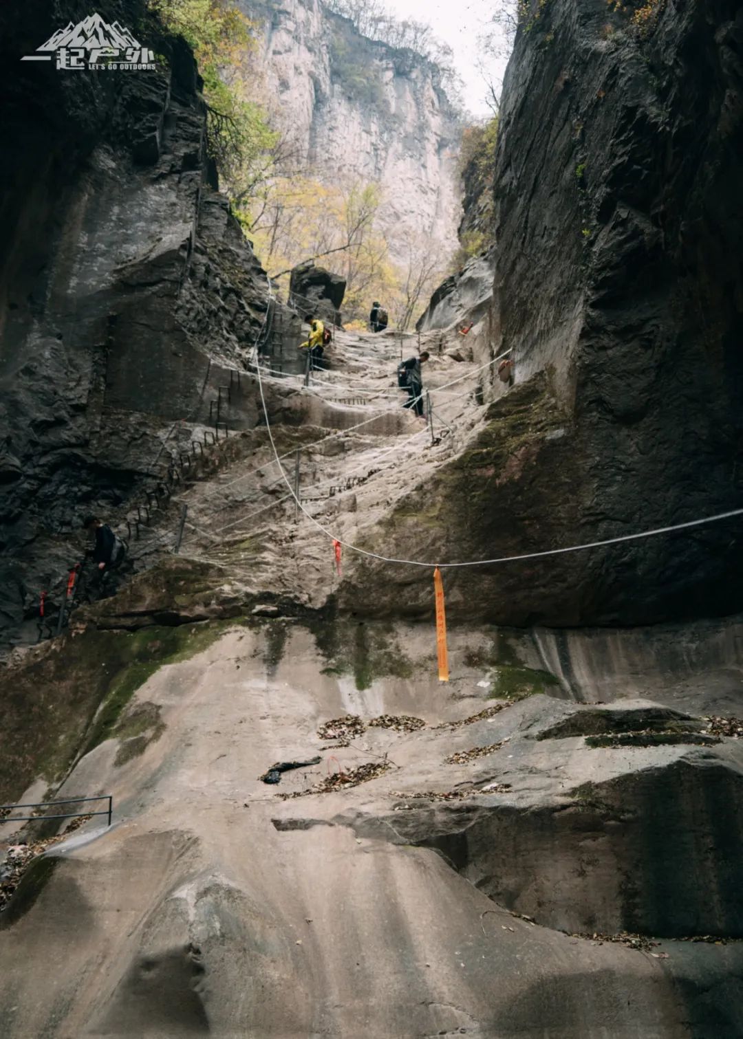这里是马武寨通往抱犊村的“古早版”捷径,老一辈人因为交通不便,硬生生走出来的一条路。谷底与周围峰岭落差近千米,顺河槽前行,道路突然陡急下跌,两边悬崖绝壁犬牙交错、荫天敝日,仰头只见一线蓝天,所以有“一线天”之称,有几处斗折曲径,前不见出口,后不见来路,似被石壁禁锢,直到近前才峰回路转,峭壁放宽,豁然开朗,强烈突变的地势环境形成与陵川其它地方截然不同的两种气候,造就出“北国江南”的山水奇观。带给你的是超乎想象的震憾与赞叹。这条路线也充满了野趣和挑战,时而穿梭于河滩之间,时而紧贴悬崖边缘,让人心跳加速。途中有三处较为狭窄的断崖,看着吓人,其实有两侧铁链保护,小心行走还是很安全的。