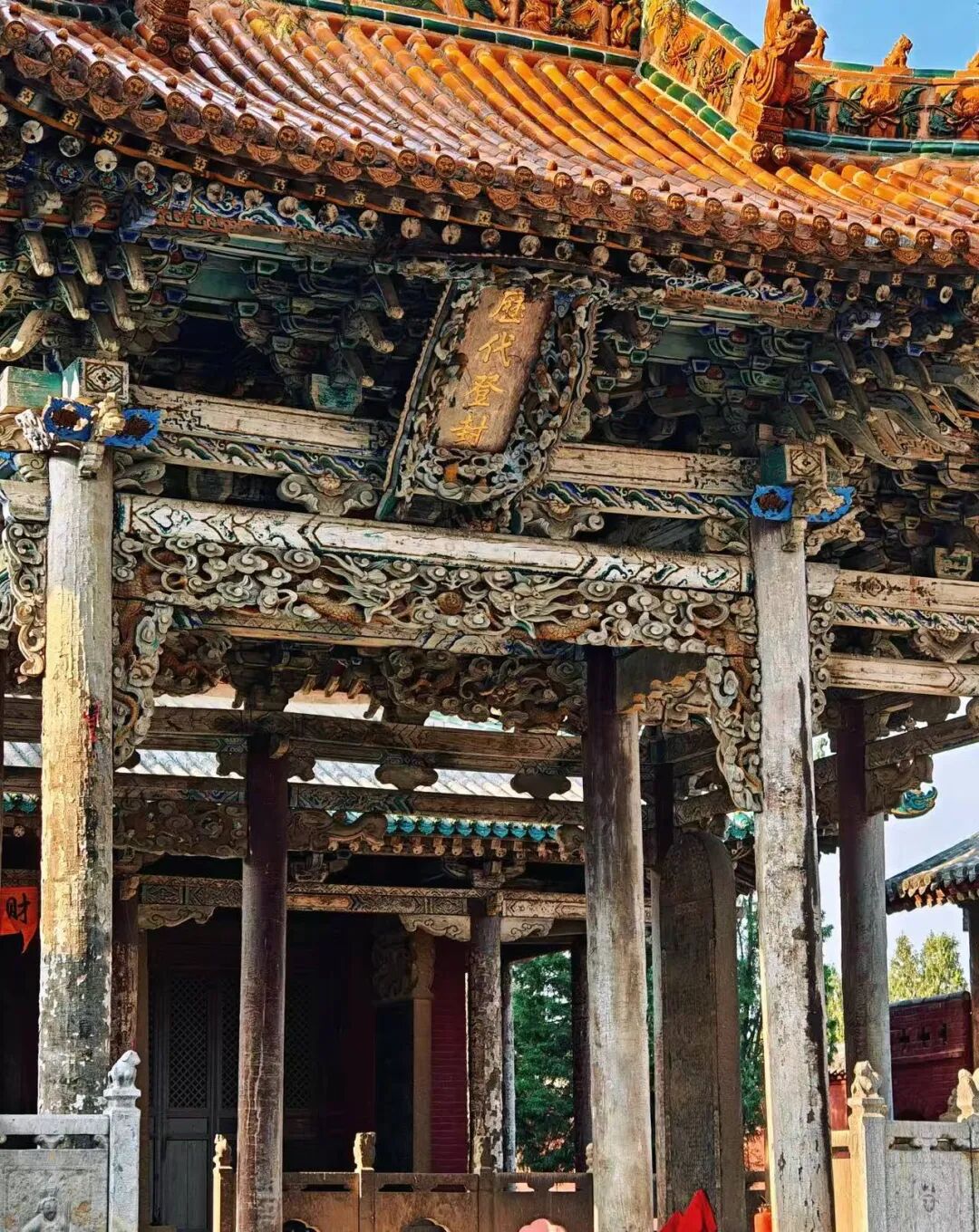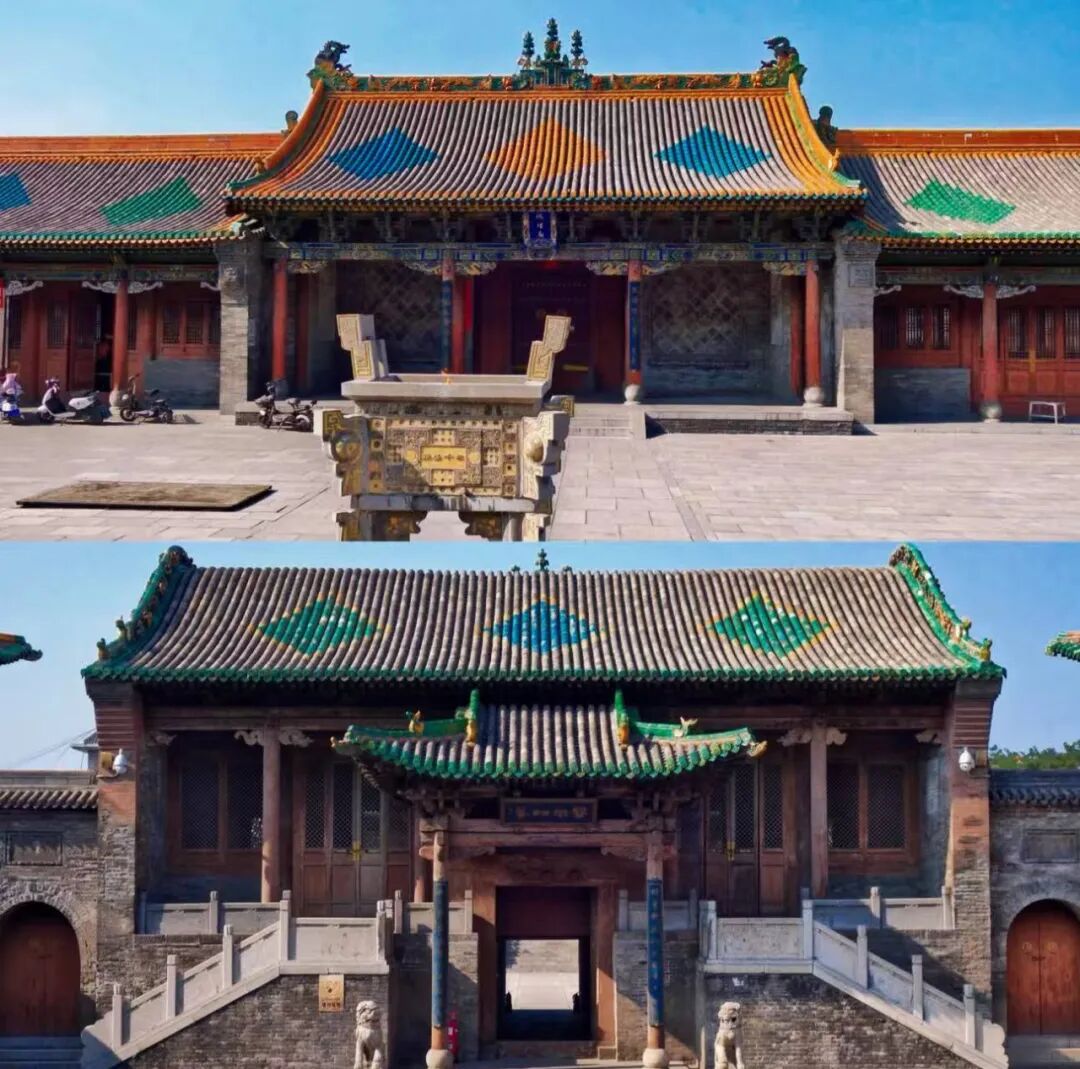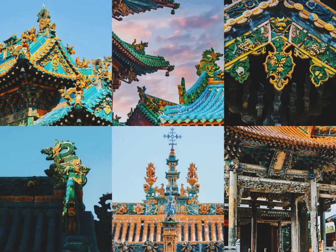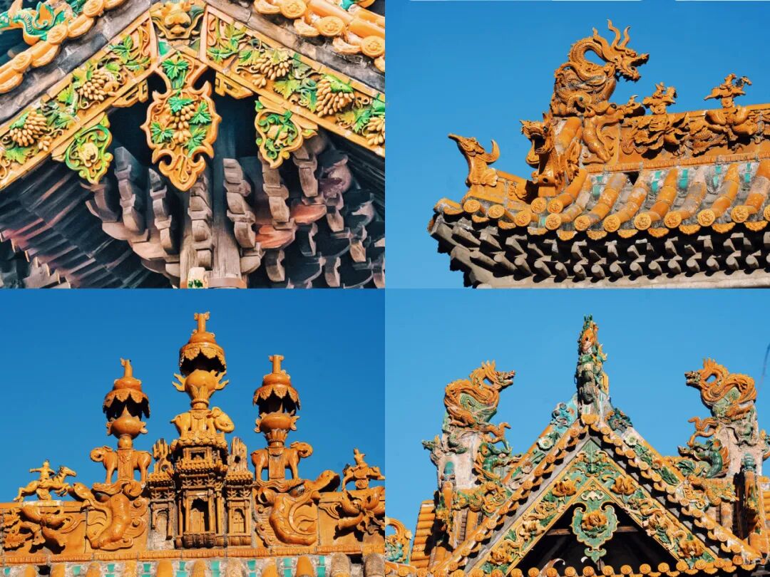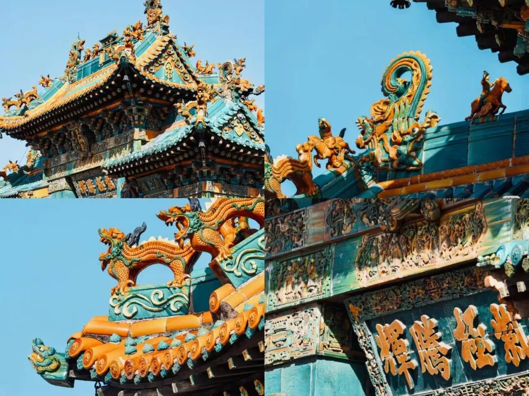 古人曾用“如鸟斯革,如翚斯飞”来比喻飞檐舒展壮丽之美,说起屋顶上美轮美奂的琉璃饰件,就不得不提到介休。在这里,冠宅以礼的中式美学体现的淋漓尽致,脊饰、砖瓦、照壁、牌坊、琉璃碑,极负视觉冲击。