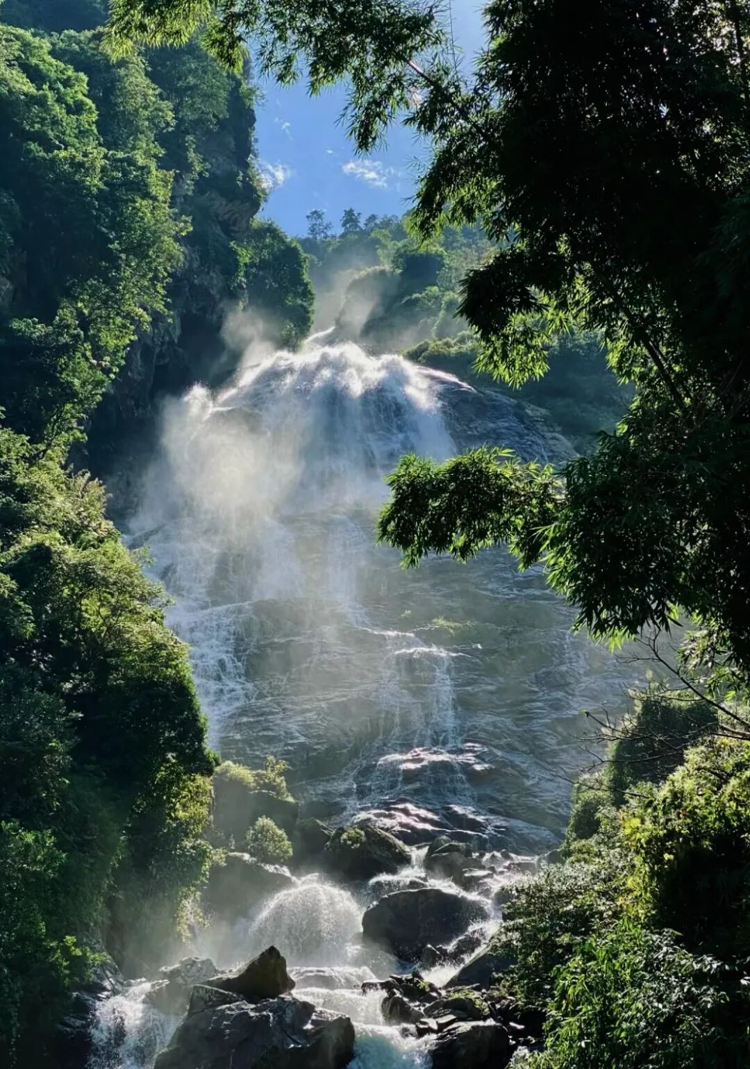 南恩瀑布是哀牢山国家森林公园中的一颗璀璨明珠。在傣语中,"南恩"寓意着"银白色的水",恰如其分地描绘了这道瀑布如银链般悬挂于山间的壮丽景象。瀑布源自哀牢山之巅,落差达百米有余。水流从高崖上倾泻而下,浪花飞溅,水雾弥漫。四周悬崖峭壁,奇岩异石星罗棋布,与瀑布的磅礴气势相映成趣,构成了一幅动人心魄的自然画卷。
