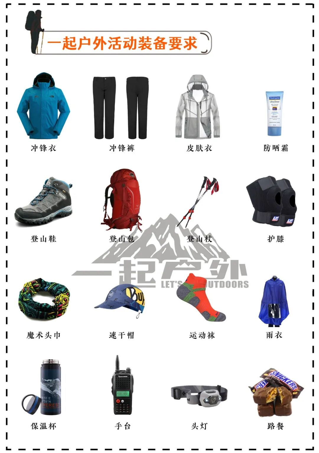 登山包(30-38升)、登山鞋/徒步鞋、速干长袖长裤、冲锋衣冲锋裤(备保暖衣物、轻薄羽绒早晚可使用)、登山杖(带雪托)、护膝(保护膝盖)、遮阳帽、防晒手套、隔脏睡袋、魔术头巾、头灯、保温杯/水袋、无线电手台(