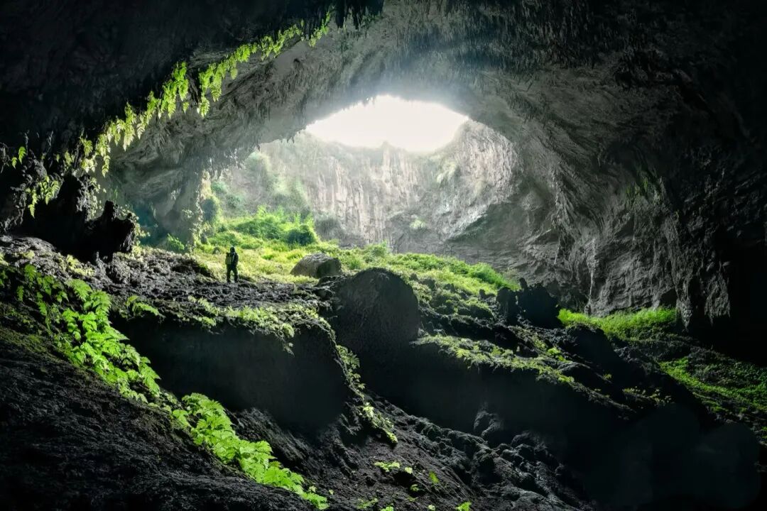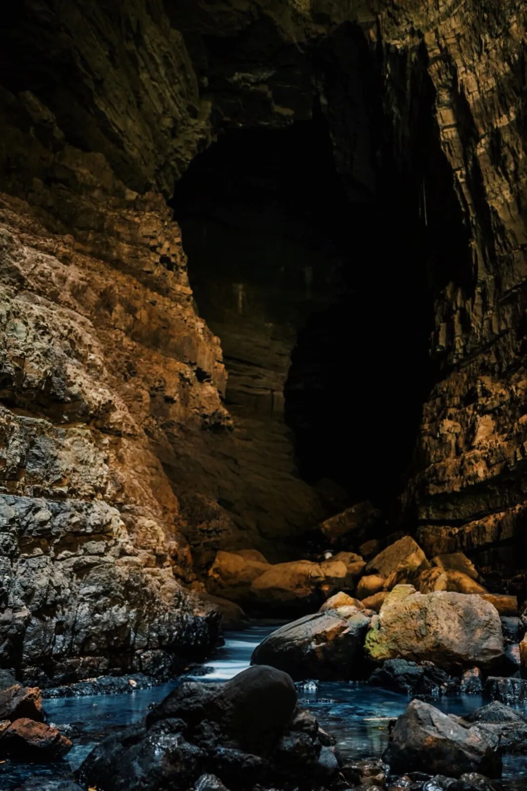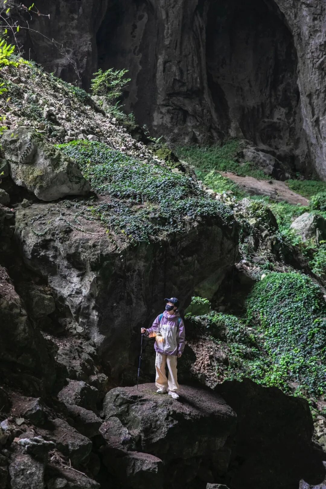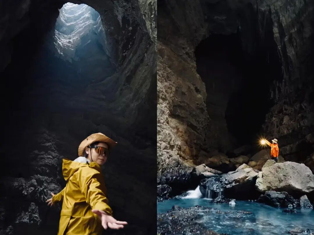 与大圣之眼相邻,山体连绵起伏,如凝固的浪涛,又似卧于群山间的巨牛,褶皱的岩壁是它粗糙的皮毛,每一道纹路都藏着风与水的印记,洞外怪石嶙峋,犹如异域星球。洞中藏有飞瀑,高约30米,行知洞口,未见真身,水流轰鸣声已不绝于耳。牛倒瀑布游玩窗口期极短,每年春夏汛期来临,洞内洞口皆被淹没,如无法进洞,在外面观赏也非常震撼。