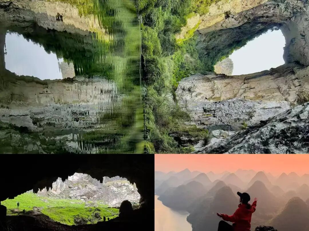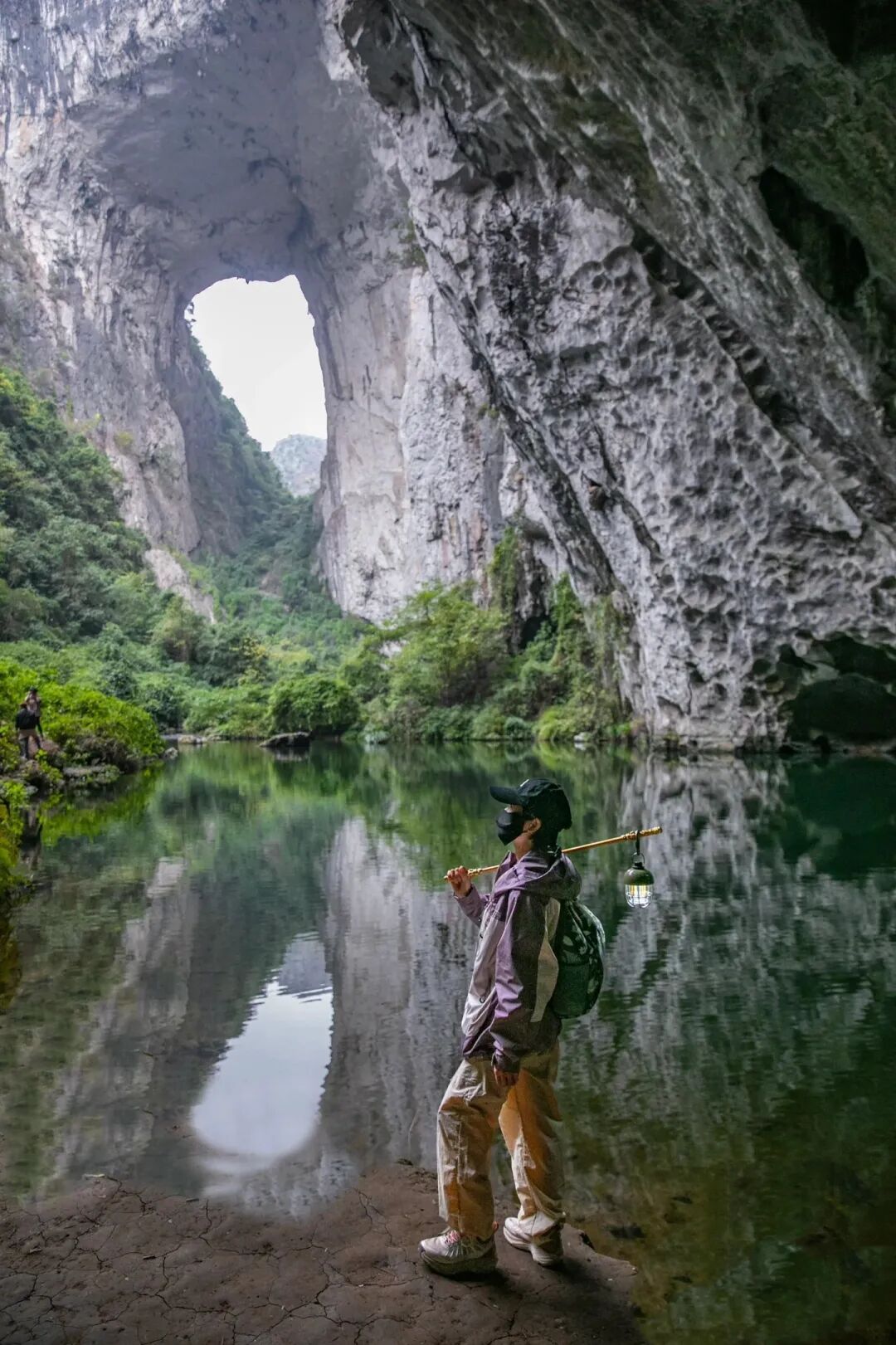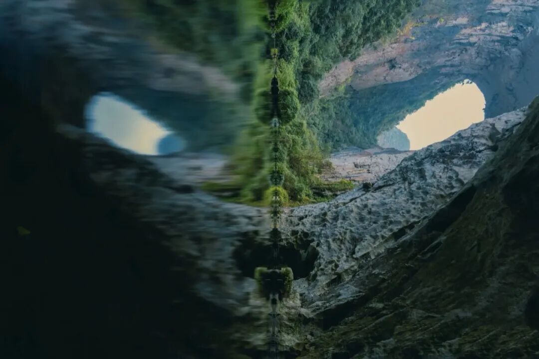 在无人知晓的深山里,暗藏了一条地下河,喀斯特天门与水中的倒影,巧合地形成了一张猴面。大圣之眼的奥秘在于溶洞天坑底部的碧绿水潭。当无风时,水面倒映出天门洞的轮廓,形成一张怒目圆睁的“齐天大圣”面孔——双目炯炯有神,鼻梁挺拔,仿佛从神话中跃然眼前。若风起水波,画面则瞬息万变,更添奇幻色彩。