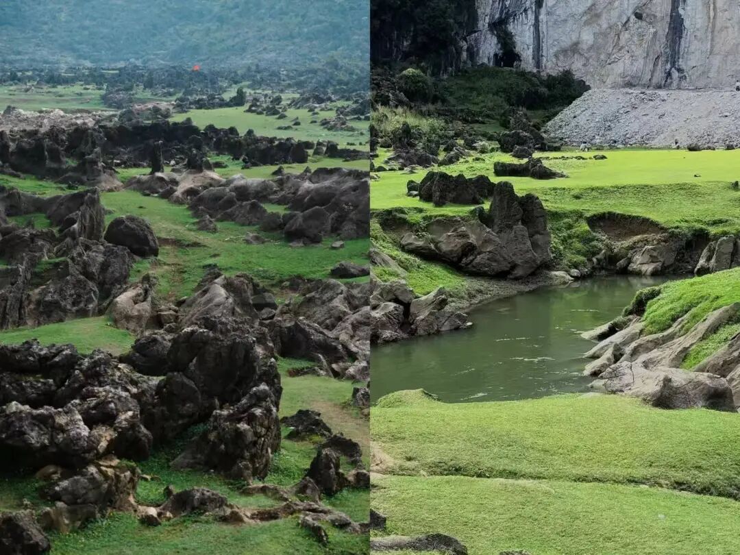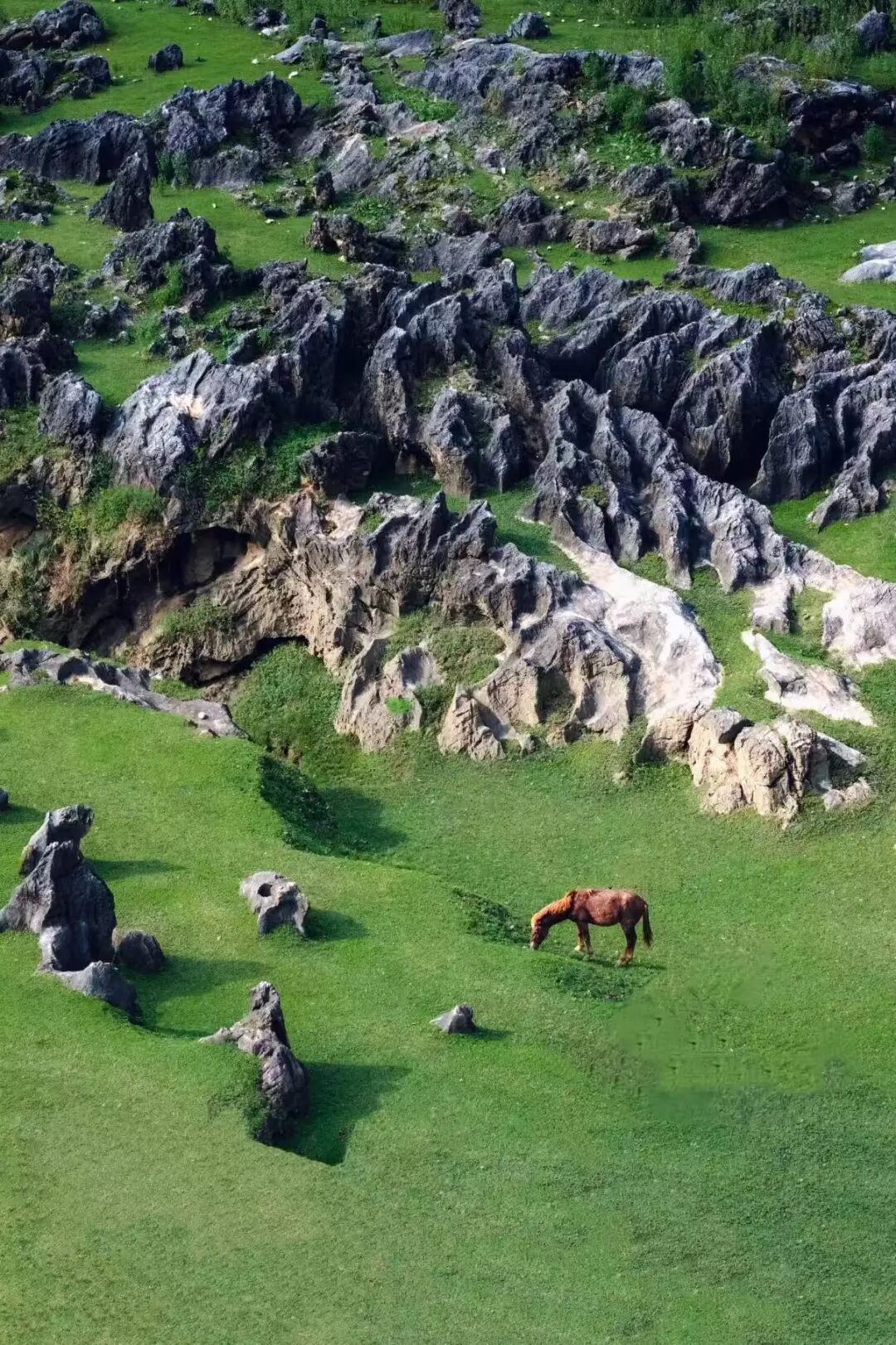 铜鼓荡藏于安顺市西秀区龙宫镇陇嘎村,是一片没有围墙与喧嚣的原生态秘境。这里灰黑色的喀斯特石林形态各异,或如利剑指天,或如巨兽蛰伏,翠绿茶甸嵌于石缝之间,牛马悠然漫步其中,画面静谧治愈,仿佛“孤独星球”般纯粹,随手一拍都是视觉大片。