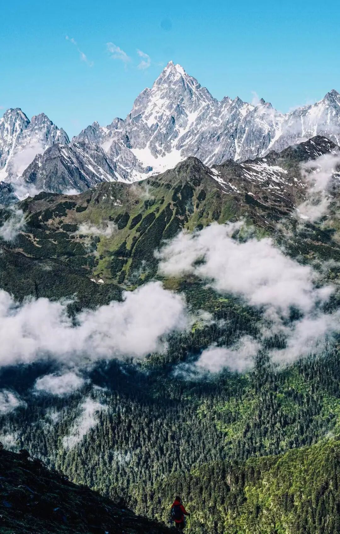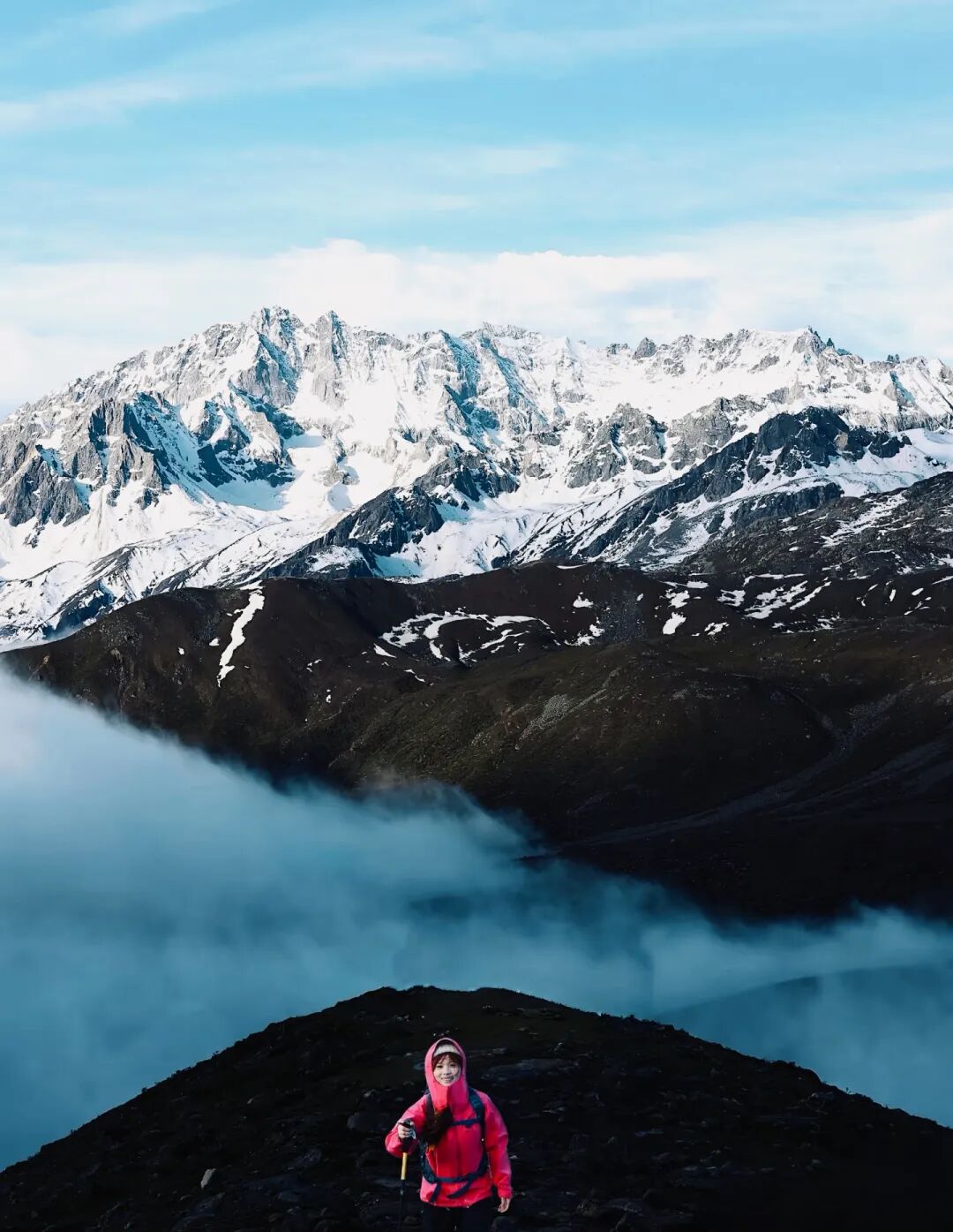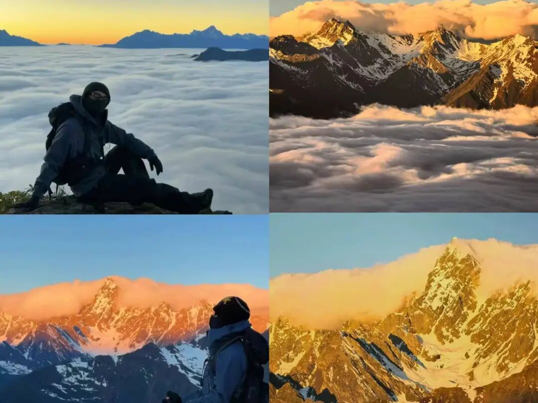 往上,是云海漫过脚边、阳光给雪山镶上金边的壮阔
