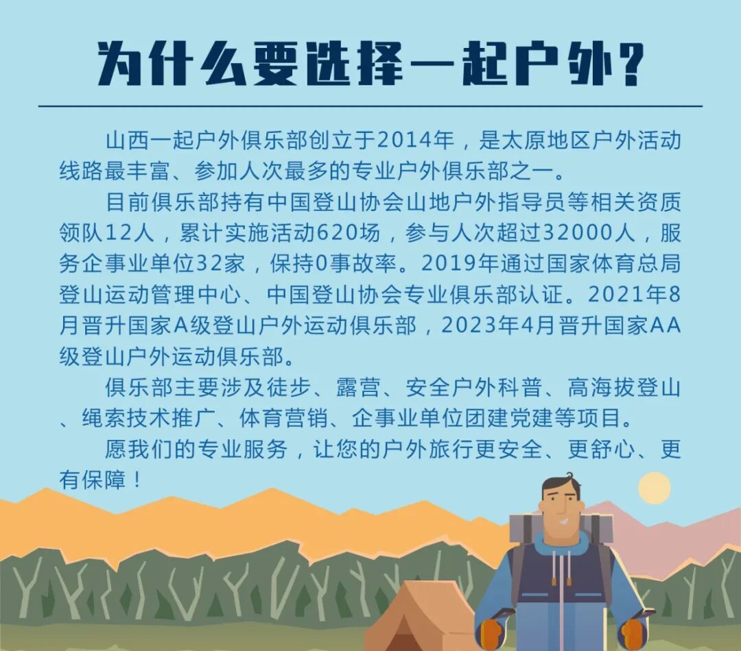 从2016年开始,一起户外在山西的大山里陆续开发40多条新线路,2022年我们正式将线路探索的活动类型命名为“探路先锋”。户外中你永远都不知道会发生什么、遇到什么,可以确定的是:户外中你总能收获点什么,好的坏的,每时每刻都充满着新奇,让你觉得一切都没有那么一成不变的呆板,这就是户外的魅力。
